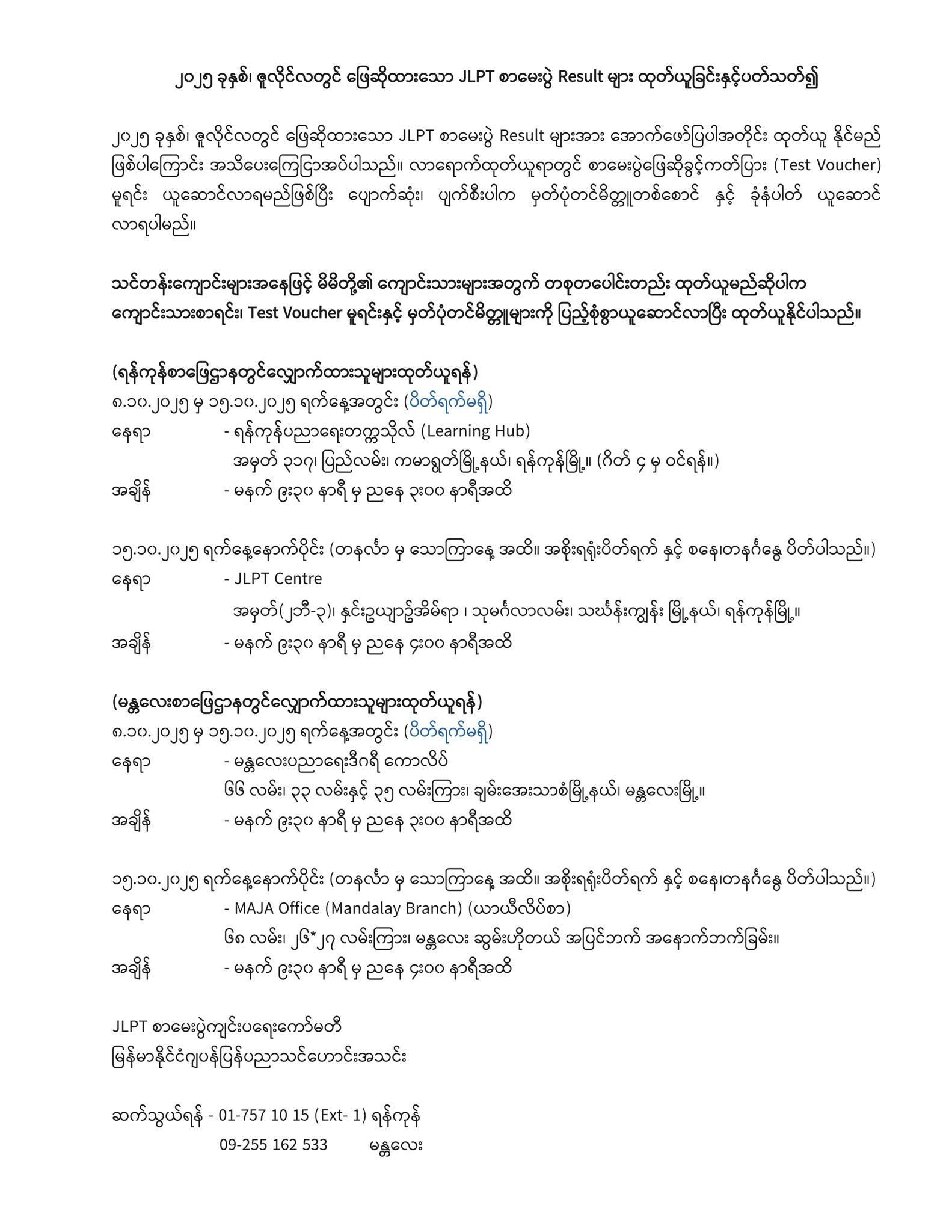 ၂၀၂၅ ခုနှစ်၊ ဇူလိုင်လတွင် ဖြေဆိုထားသော JLPT စာမေးပွဲ Result များအား အောက်ဖော်ပြပါအတိုင်း ထုတ်ယူ နိုင်မည် ဖြစ်ပါကြောင်း အသိပေးကြေငြာအပ်ပါသည်။ လာရောက်ထုတ်ယူရာတွင် စာမေးပွဲဖြေဆိုခွင့်ကတ်ပြား (Test Voucher) မူရင်း ယူဆောင်လာရမည်ဖြစ်ပြီး ပျောက်ဆုံး၊ ပျက်စီးပါက မှတ်ပုံတင်မိတ္တူတစ်စောင် နှင့် ခုံနံပါတ် ယူဆောင် လာရပါမည်။