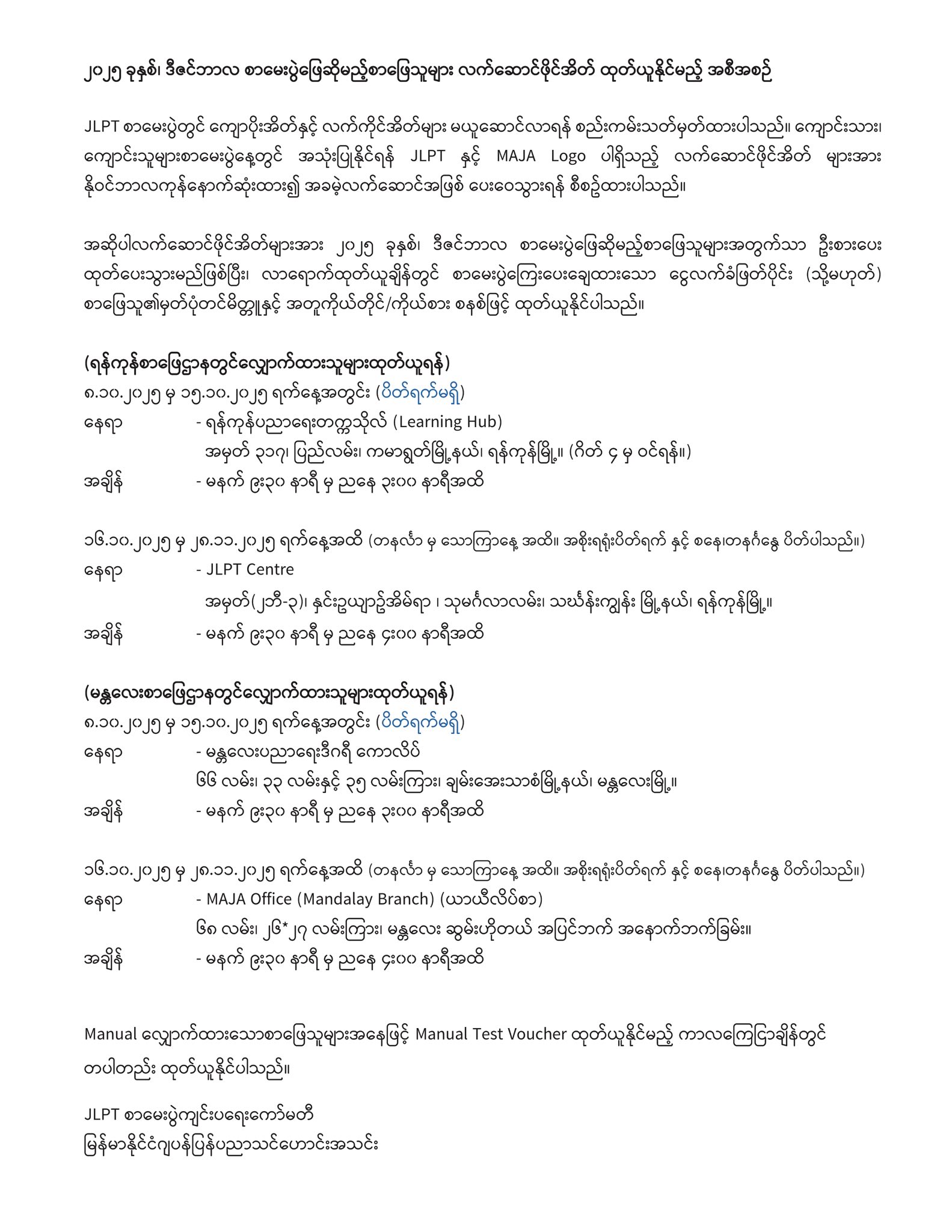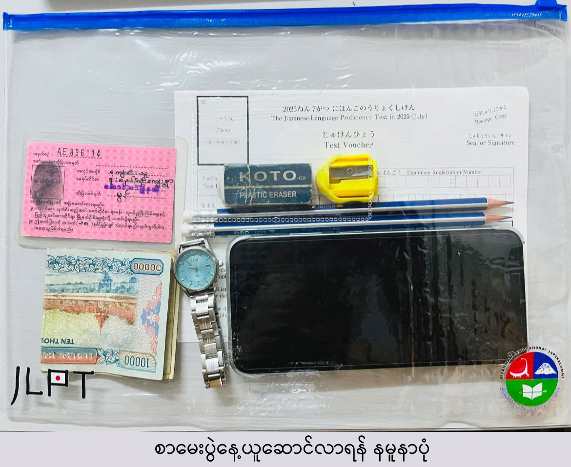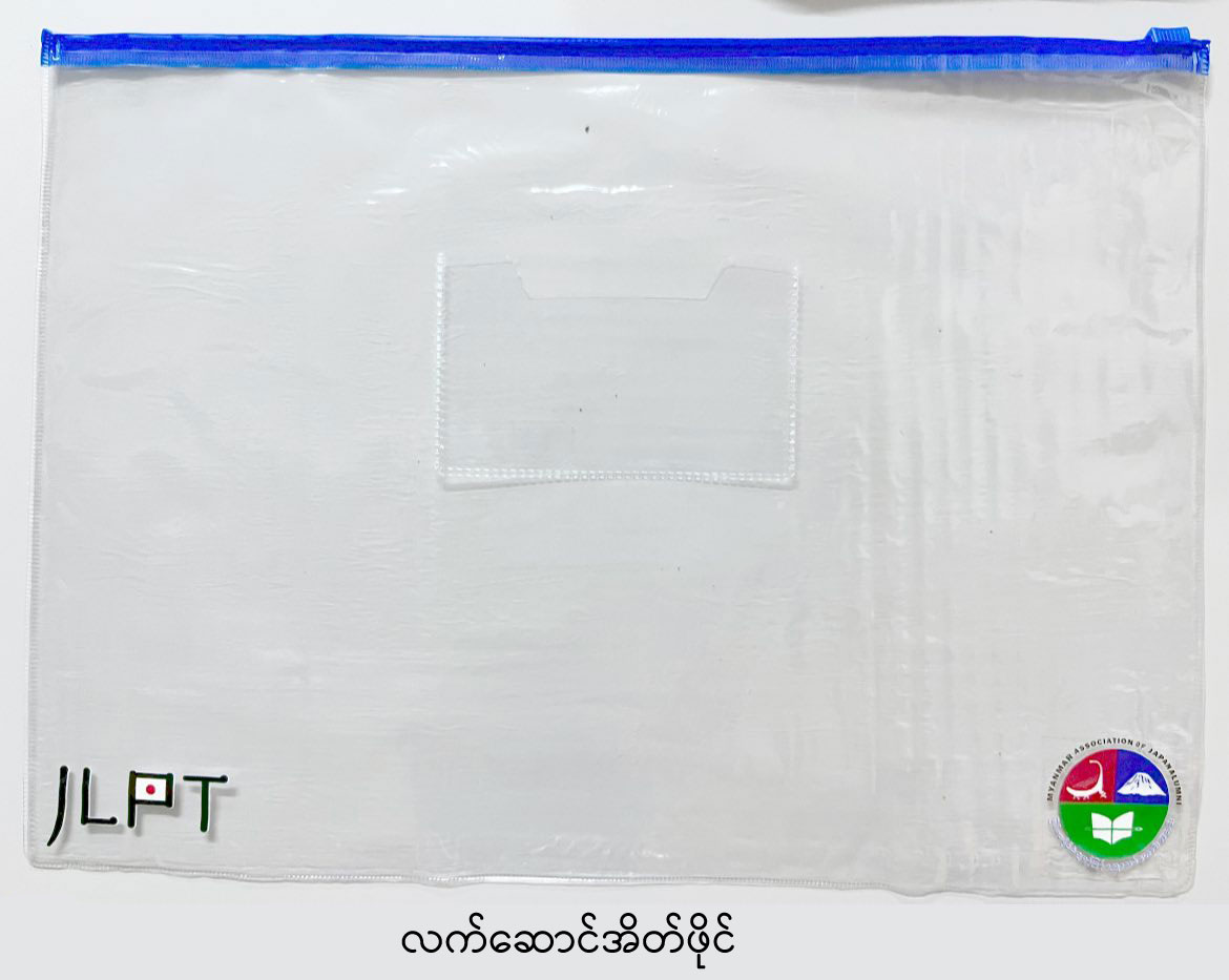 JLPT စာမေးပွဲတွင် ကျောပိုးအိတ်နှင့် လက်ကိုင်အိတ်များ မယူဆောင်လာရန် စည်းကမ်းသတ်မှတ်ထားပါသည်။ ကျောင်းသား၊ ကျောင်းသူများစာမေးပွဲနေ့တွင် အသုံးပြုနိုင်ရန် JLPT နှင့် MAJA Logo ပါရှိသည့် လက်ဆောင်ဖိုင်အိတ် များအား နိုဝင်ဘာလကုန်နောက်ဆုံးထား၍ အခမဲ့လက်ဆောင်အဖြစ် ပေးဝေသွားရန် စီစဥ်ထားပါသည်။