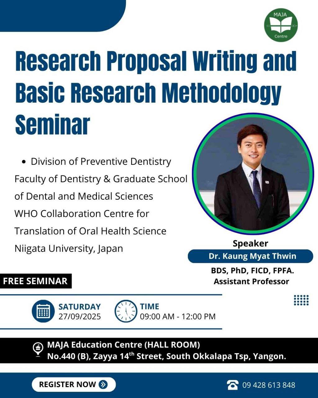 သုတေသနပညာရပ်များကို စိတ်ဝင်စားသောလူငယ်များနှင့် တက္ကသိုလ်၊ ပညာသင်ဆုများ လျှောက်ရာတွင် လိုအပ်သော research proposal များရေးသားရာတွင် အထောက်အကူ ပြုရန်အတွက် မာဂျာပညာရေးစင်တာ (MAJA Education Centre) မှ Research Proposal Writing and Basic Research Methodology Seminar လေး စီစဉ်ပေးလိုက်ပါတယ်။