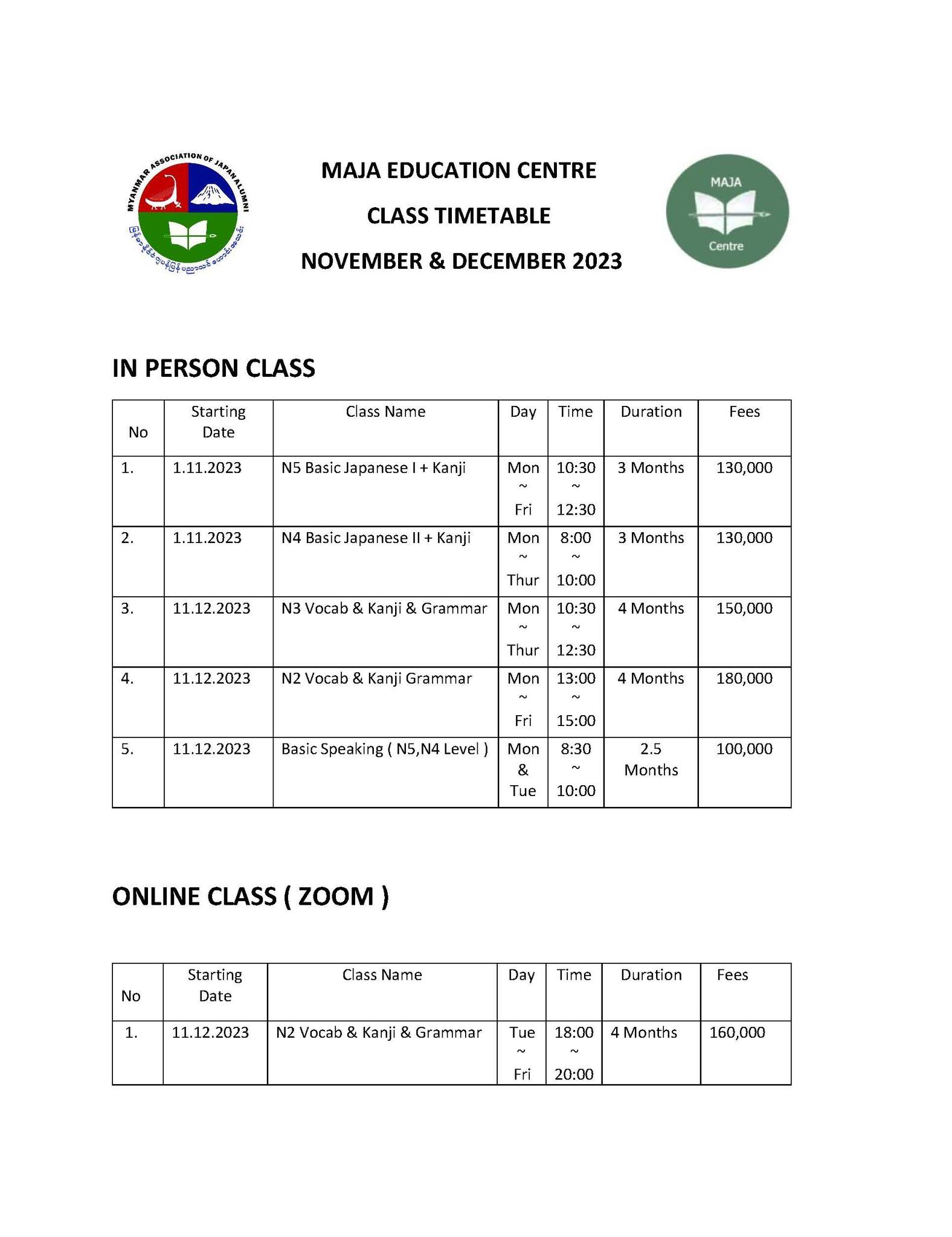 MAJA EDUCATION CENTRE မှ ၂၀၂၃ ခုနစ် November နှင့် December လတို့တွင် ဂျပန်ဘာသာတန်းခွဲသစ်များကို ထပ်မံ ဖွင့်လှစ်သွားမည် ဖြစ်ပါသည်။