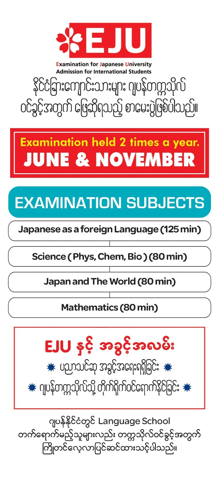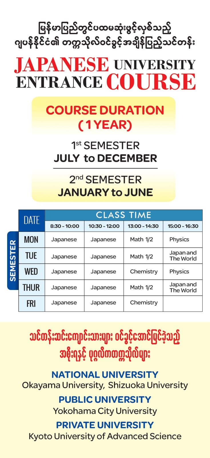 EJU အတွက် လိုအပ်သည့် အခြေခံနှင့် စာမေးပွဲလေ့ကျင့်မှုများကို လုံလောက်စွာ ပြုလုပ်သွားနိုင်ရေးအတွက် ယခုအချိန်အထိ ၆ လ သင်တန်းဖြင့် ဖွင့်လှစ်လာခဲ့တာကို ၁ နှစ် သင်တန်းအဖြစ် တိုးမြင့်ဖွင့်လှစ်လိုက်ခြင်း ဖြစ်ပါတယ်