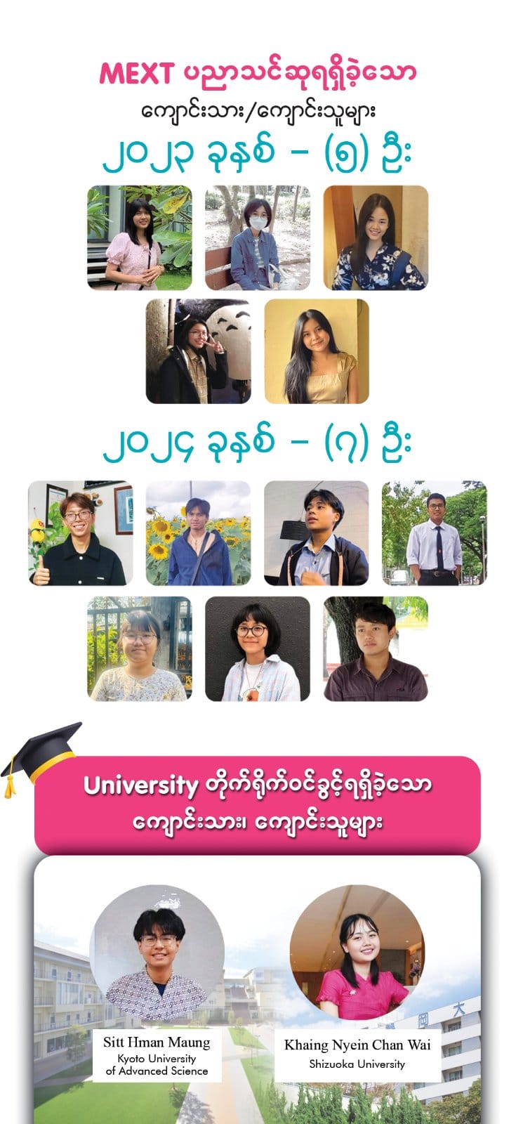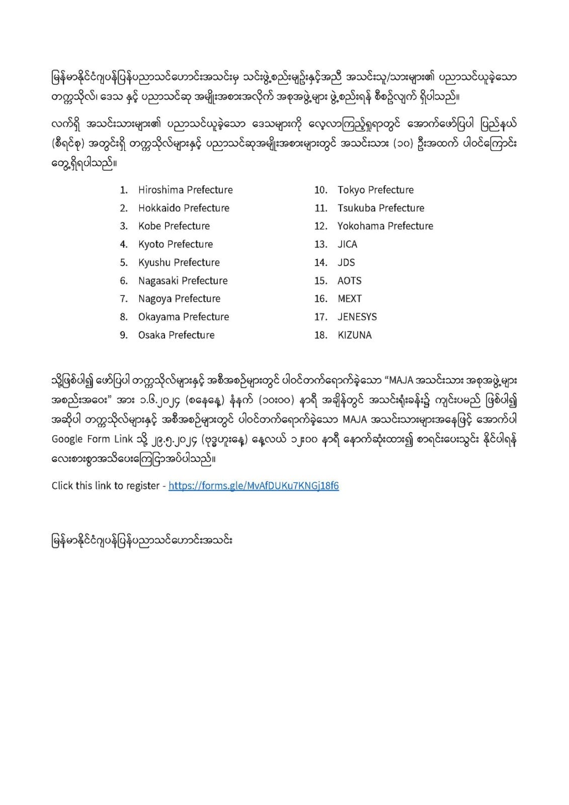 MEXT Scholarship အတွက် ပြင်ဆင်လိုသူများနှင့် ဂျပန်နိုင်ငံရှိ တက္ကသိုလ်များတွင် ဆက်လက်ပညာသင်ယူလိုသူများ