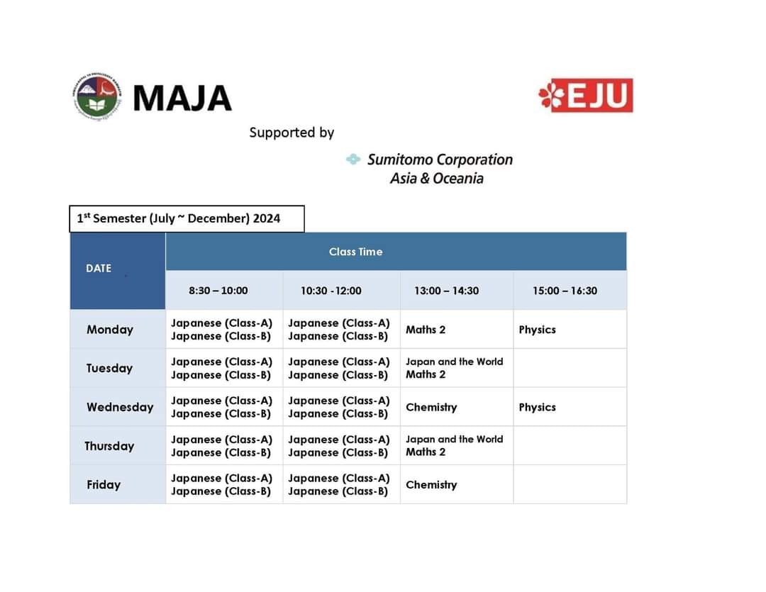 ယခုသင်တန်းဟာ မြန်မာနိုင်ငံတွင် အထက်တန်းပညာရေးအဆင့် အောင်မြင်ပြီး သော ကျောင်းသား/သူများအနေနဲ့ ဂျပန်နိုင်ငံရှိ တက္ကသိုလ်များသို့ တက်ရောက်သင်ယူရာတွင်လိုအပ်သော (Japanese University Entrance Course) ဂျပန်တက္ကသိုလ်ဝင်ခွင့်စာမေးပွဲ (EJU Exam) ဖြေဆိုရာမှာ အထောက်အကူပြုစေဖို့ MAJA မှ ဖွင့်လှစ်လာခဲ့သော “EJU Exam Preparation Class” ၏ 8th Batch ဖြစ်ပါတယ်
